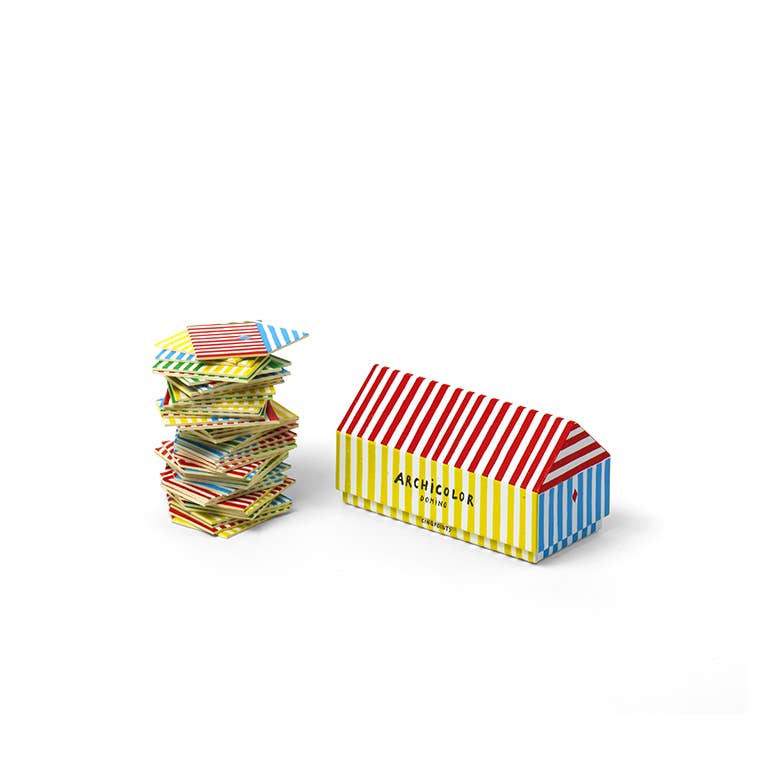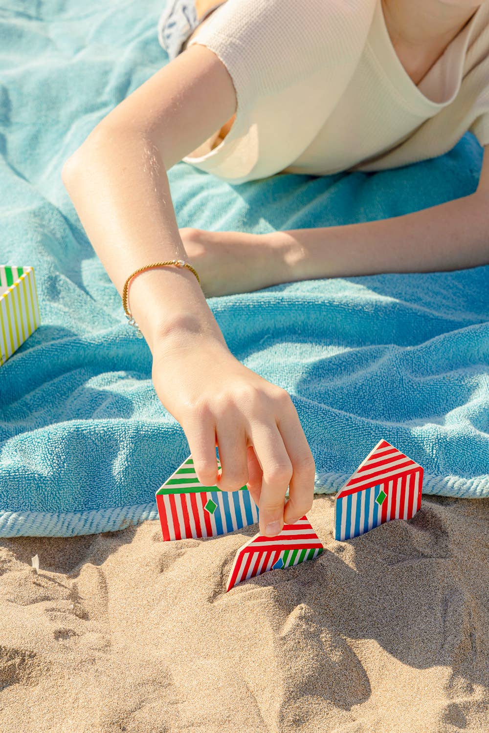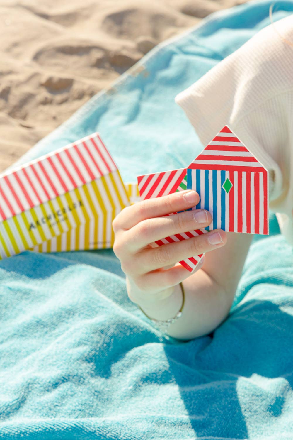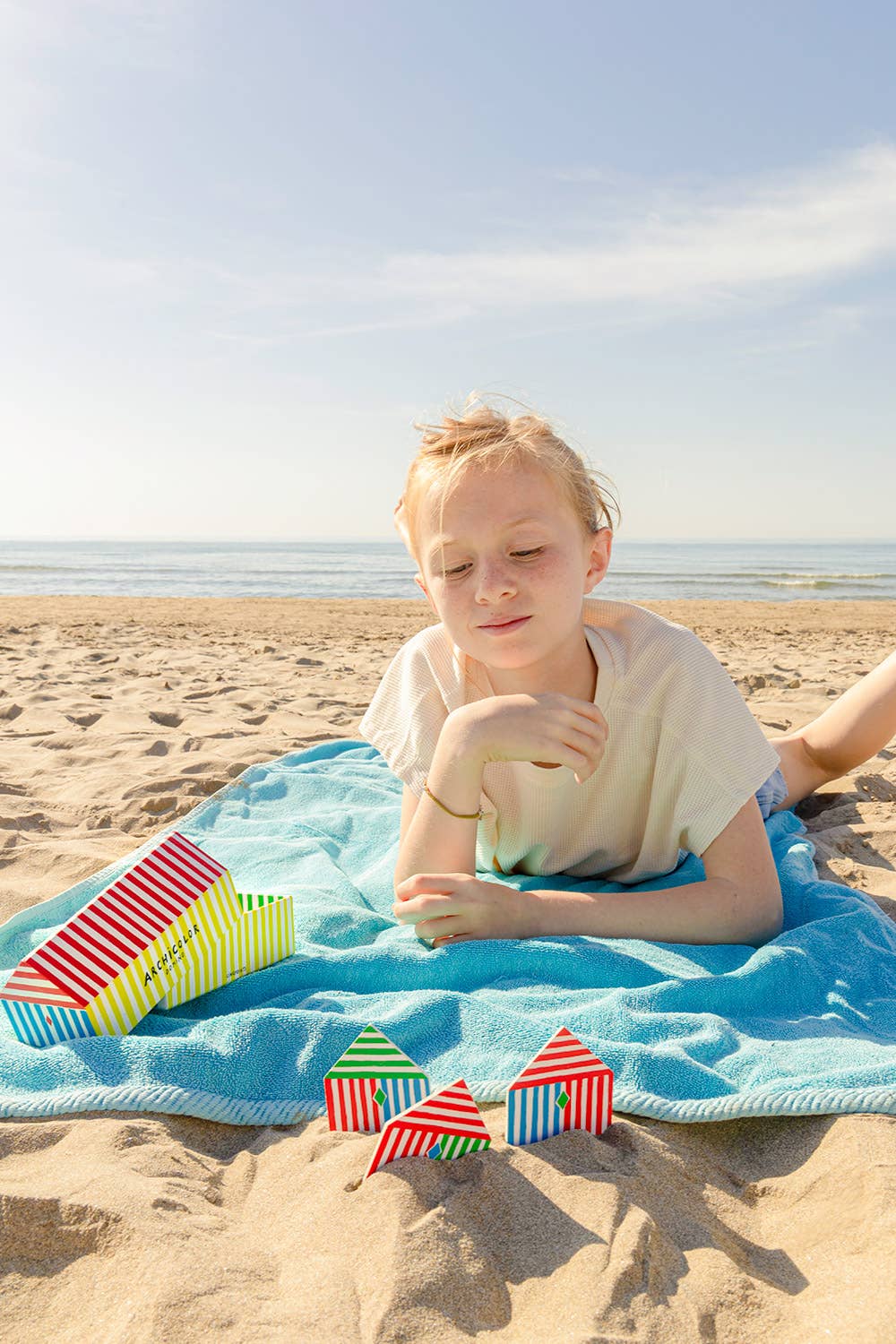 Architecture is everywhere, even at the beach! This is how this educational domino game has been designed. These tiny beach huts all have two-coloured roofs and sidewalls. It will be up to the kids to match them up with the ones they pick. The goal is to become the first empty-handed player. A fun present for the family to play together throughout the year! It is simply a game of observation and analysis, with a focus on how to match the highest numbers of walls to win.