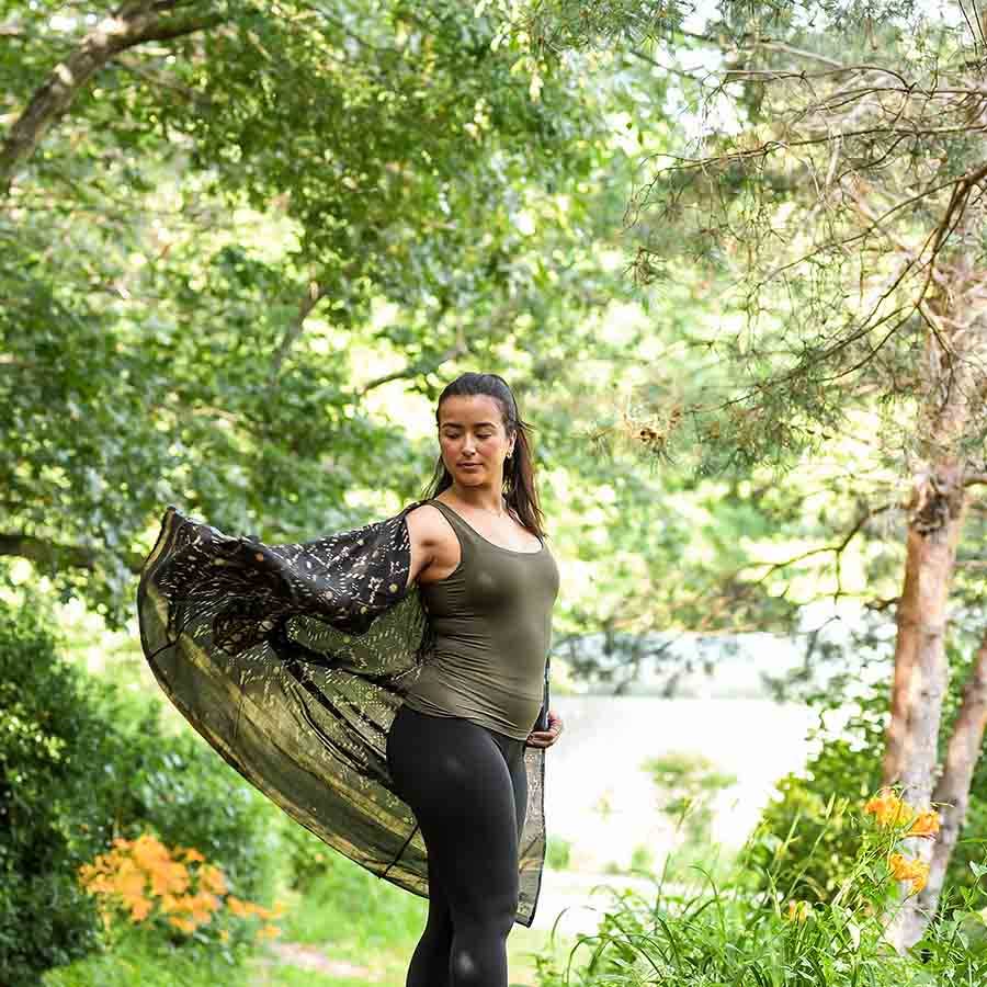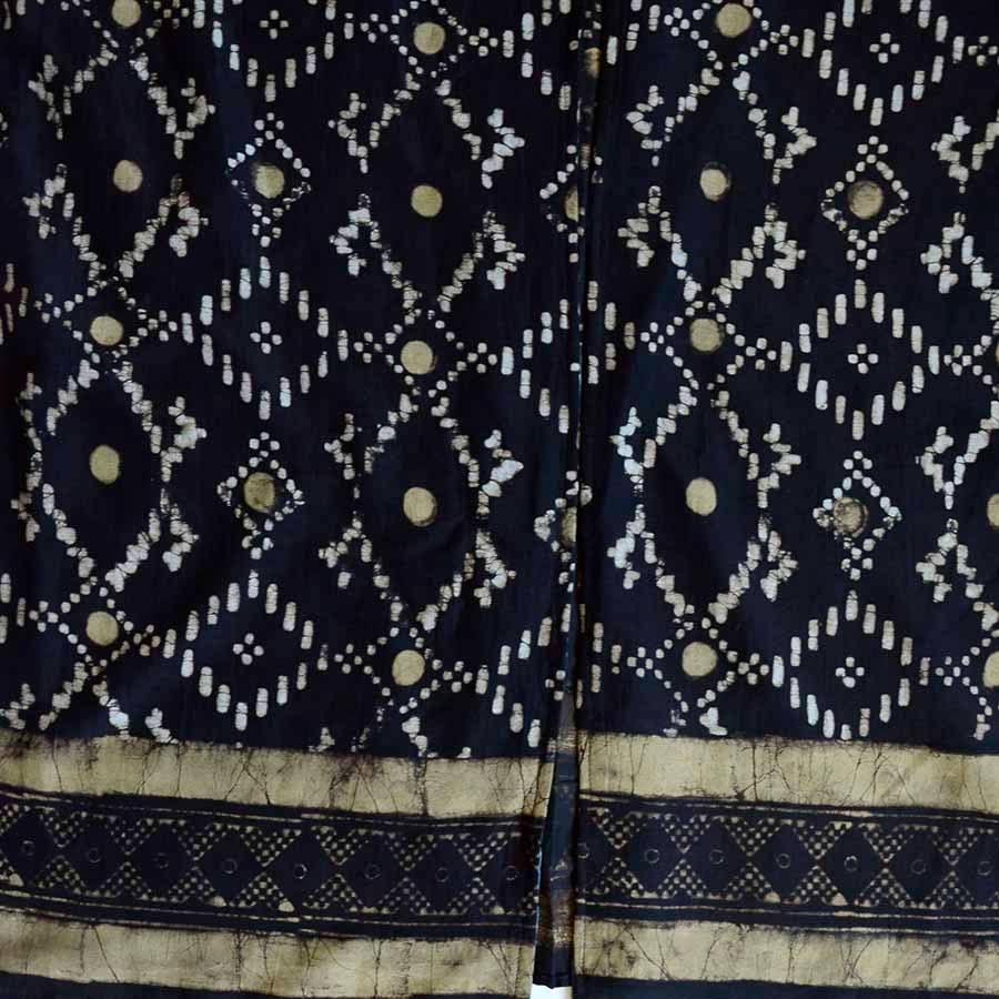 This black kimono robe features a structured geometric print, hand block printed on soft cotton-silk fabric using traditional techniques. With its golden yellow tones and clean architectural lines, it brings a refined and intentional look to your wardrobe. Thoughtfully designed and naturally dyed, the Mansa Kimono is more than just a layering piece, it’s a quiet expression of presence and strength. Whether worn as a dress, robe, or lightweight cover-up, it’s an elegant essential for everyday ease or special occasions.