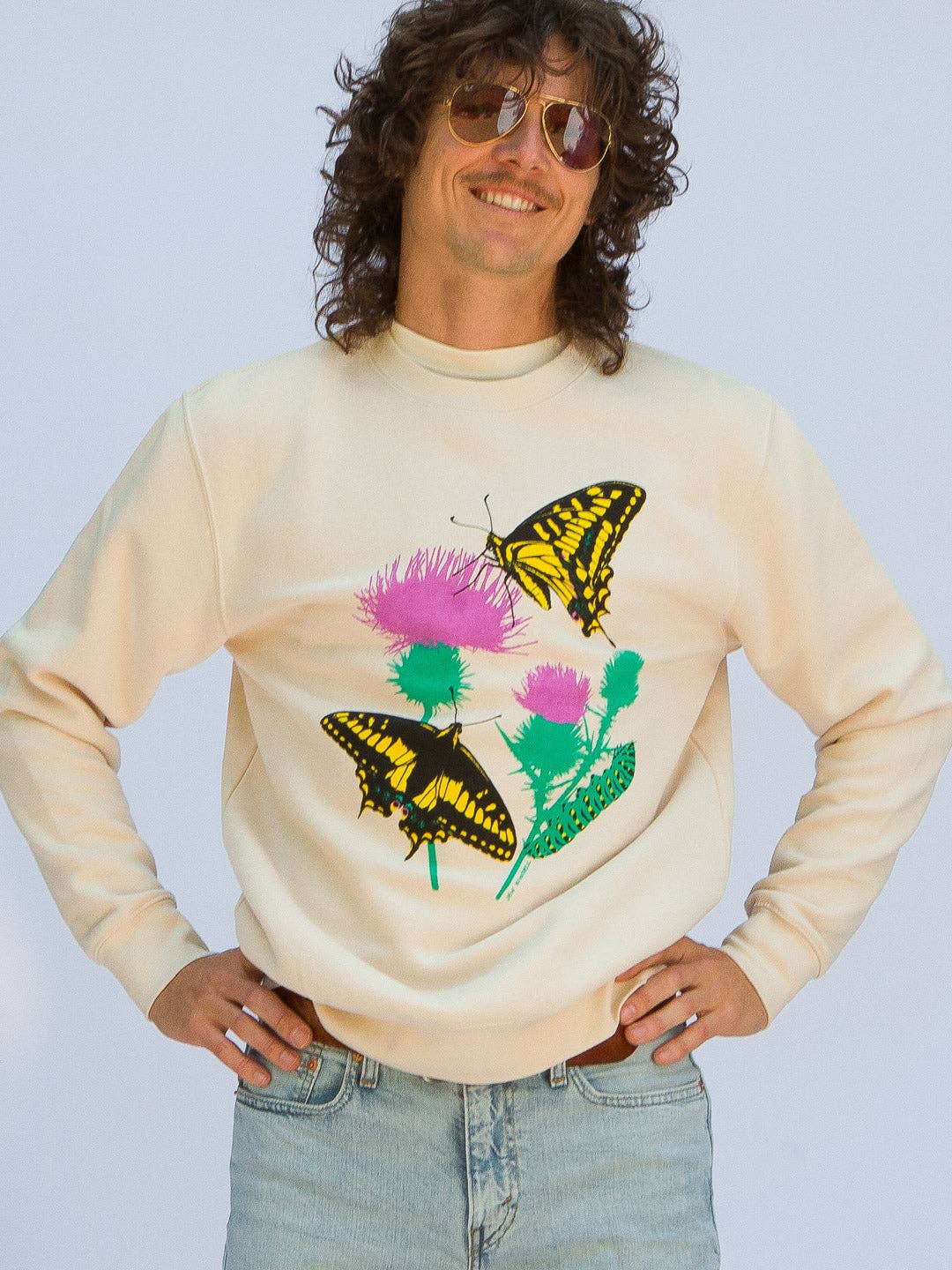 The Butterfly Garden Crewneck Sweatshirt features original work from artist Jen Kindell. Each sweatshirt is silkscreened in San Fransisco by Culk using waterbased ink, leaving virtually no feel to the graphic. Super soft unisex fit.