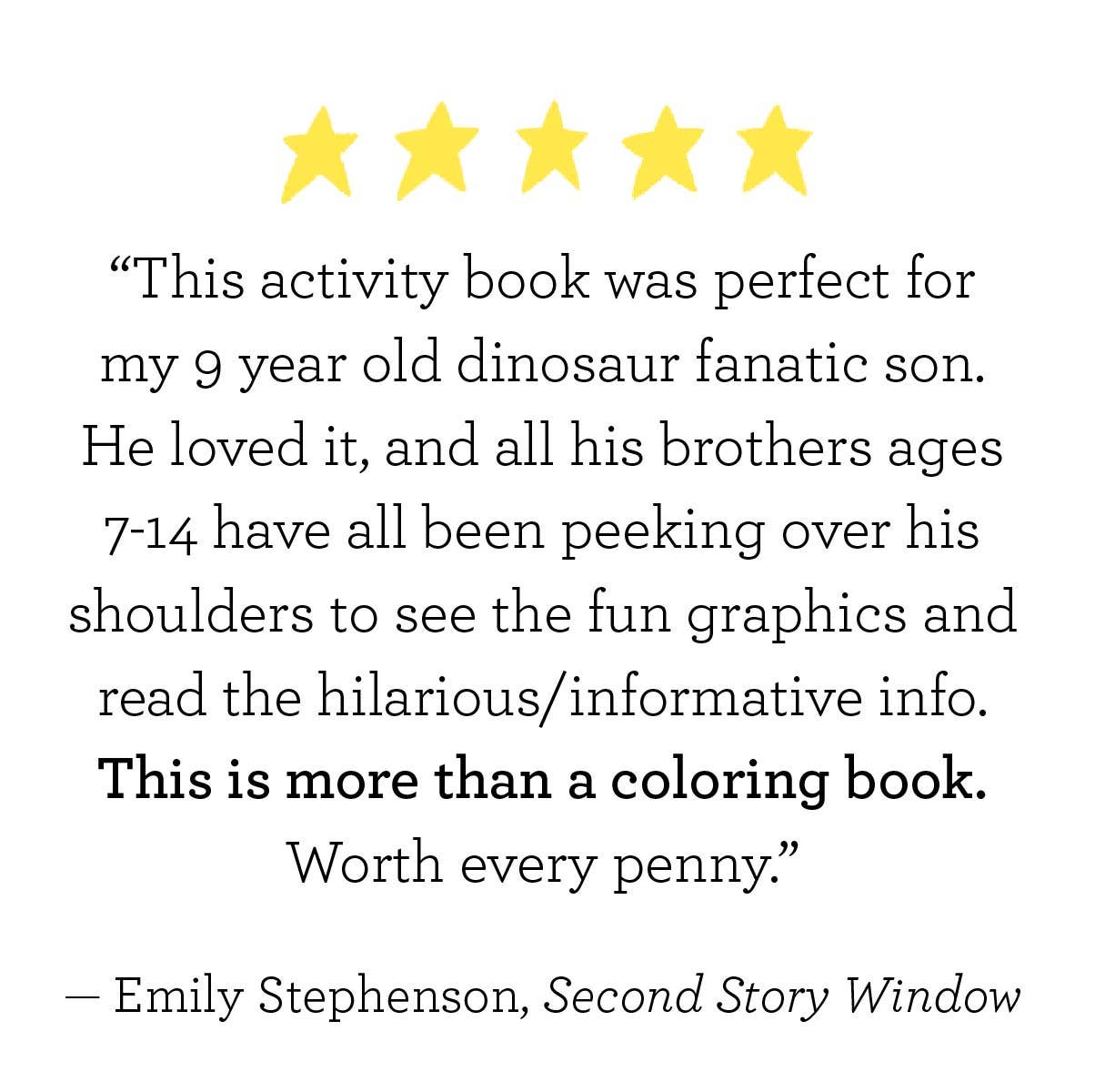 This book is the perfect fit for the dinosaur-lover as well as the dinosaur-newbie! It features well-known favorite dinosaurs (looking at YOU, T-Rex) and dinosaurs worth meeting for the first time (hello, Hatzegopteryx). This Coloring and Activity book is unlike anything else out there, and kids and parents can tell the difference! - Full of JOKES that keep kids laughing. - Packed with FUN FACTS that keep kids turning page and featuring a unique VARIETY of activities engage different parts of the brain, holding kids' attention for longer. - Works for a BROAD RANGE of ages. Even PARENTS have enjoyed doing the activities! - Activities strike the right balance between challenging and doable, which makes them VERY REWARDING to complete! These creative activities and fun-fact coloring pages relieve stress and hold your attention. Release endorphins as you solve the puzzles and LAUGH as you discover the unexpected answers! Recommended for ages 8 and up!