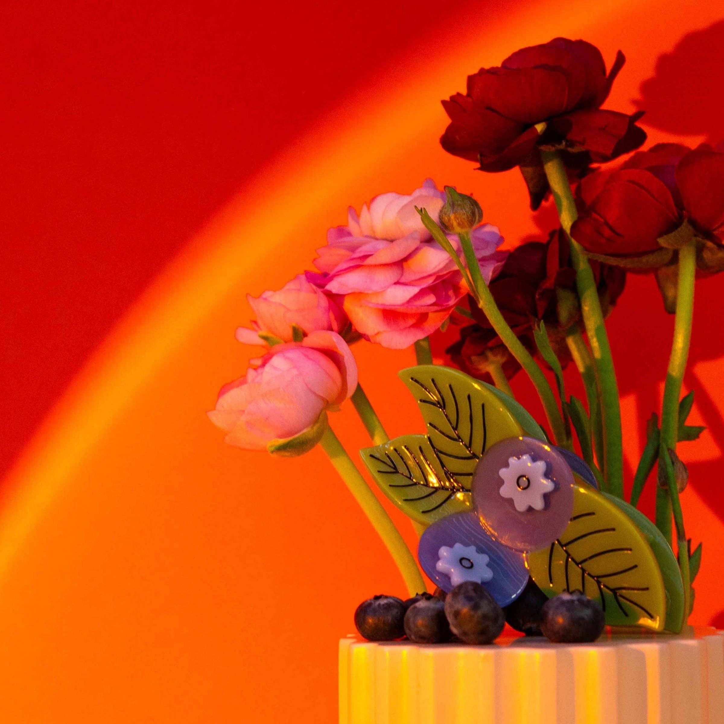 A sweet blueberry hair claw clip made from cellulose acetate, a plant-based alternative to plastic. We're in love with this sweet accessory. * This claw clip measures 4" x 2" * Color variation may occur. That's what makes it unique! * Handmade and hand painted.