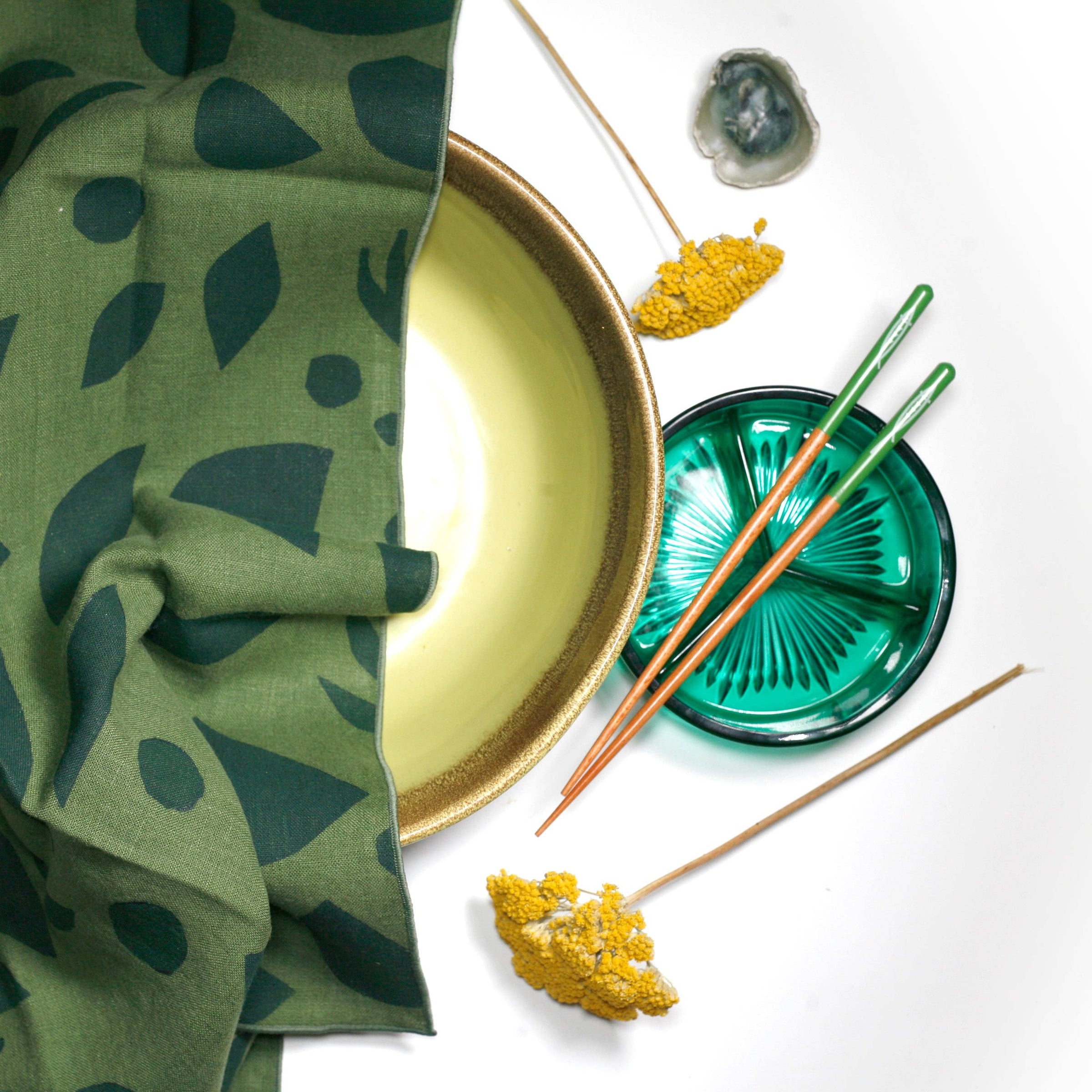 A large, luxuriously handprinted kitchen textile featuring Willow Ship's abstracted floral print. The 'Decon Floral' tea towel makes a great hostess or housewarming gift (or even wraps one). Printed by hand in GREEN colorway on FOREST GREEN Linen.