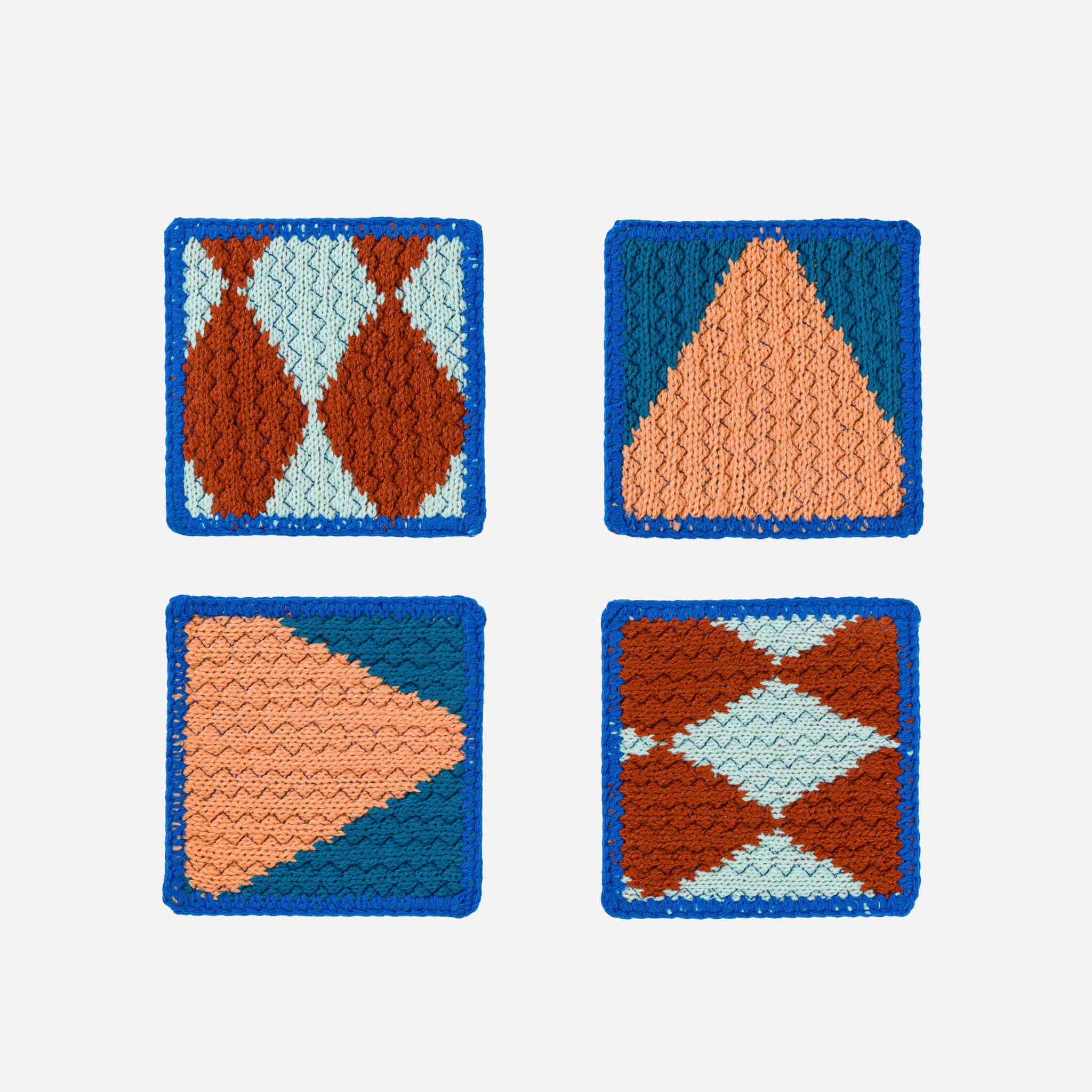 For your next dinner party or cute coffee table upgrade. Set of 4 mix-and-match reversible knit coasters made from deadstock material. Each coaster makes a matching set with solid color on one side and a mix of patterns (made from repurposed fabric) on the back. Contrast zig-zag stitching is sewn by hand. Pattern placement in each set is unique.