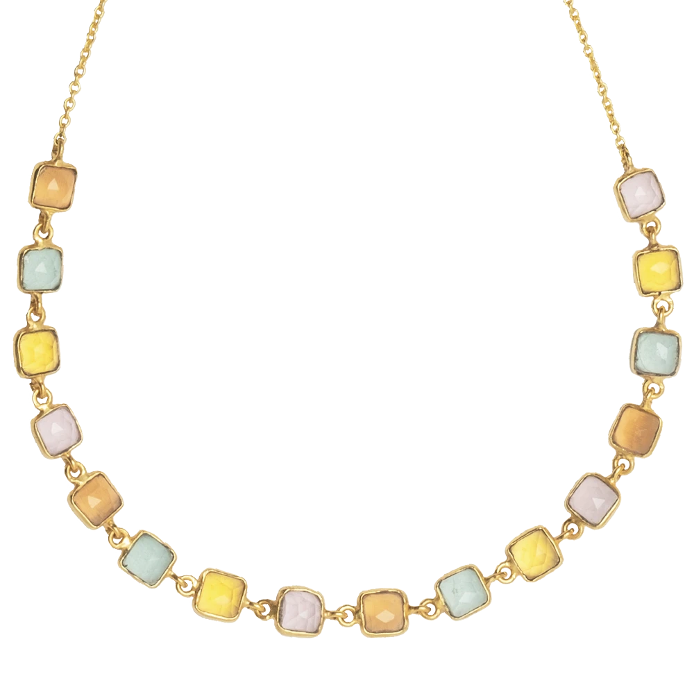 This elevated choker necklace features square cut gemstones in series of four colors of pastel shades. The length and shape looks great with casual and going out tops.
