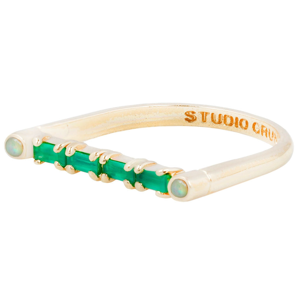 We love Studio Grun's Cha Cha Gemstone Bar rings! Each ring features 4 baguette cut gemstones framed by 2mm cabochon gemstones. Choose from a variety of gemstones including turquoise with moonstone, green onyx with opal, moonstone with pink opal, and black onyx with black opal.