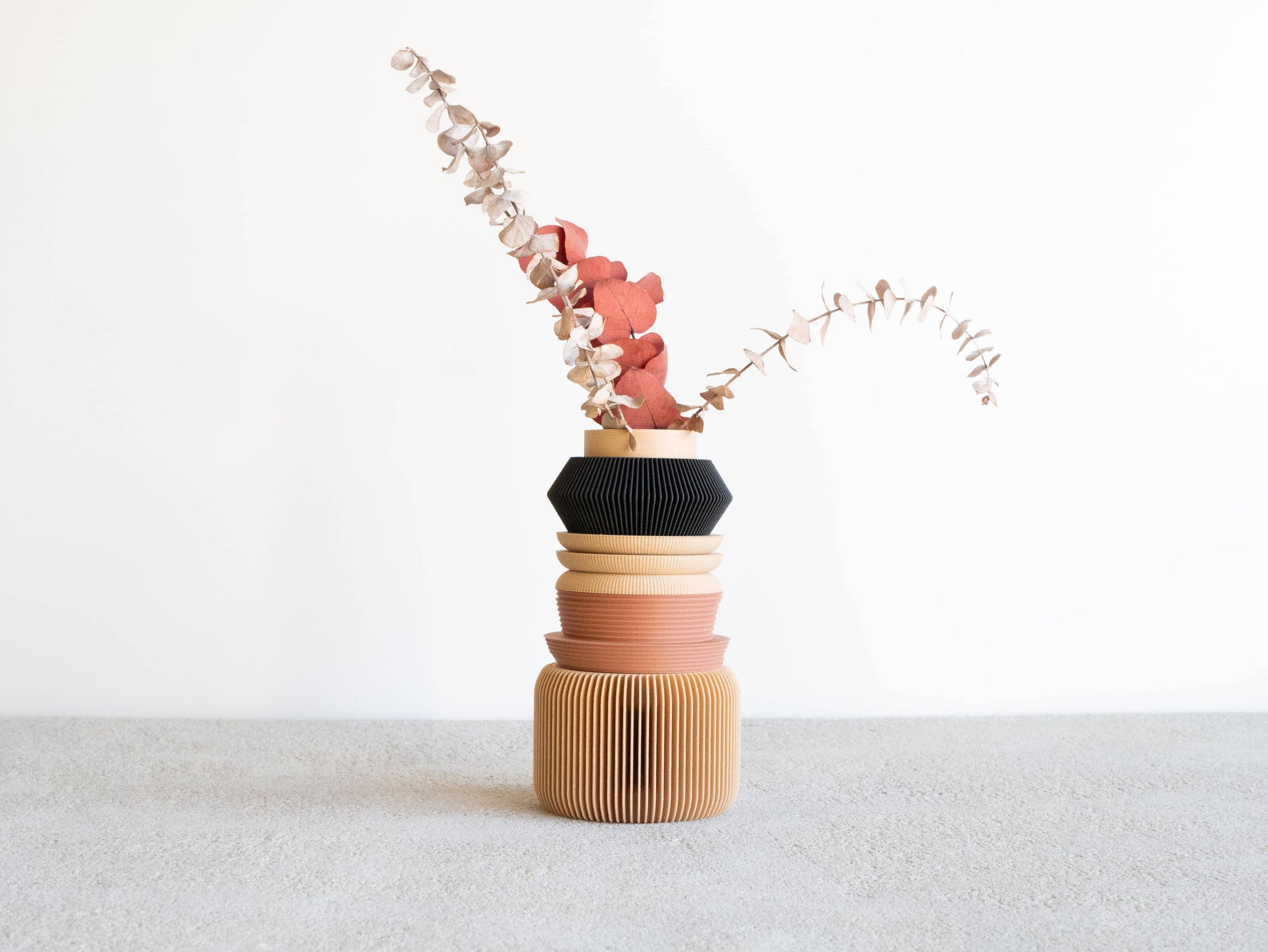 The modular NU vase is designed and 3D printed on the West Coast of France. Vases and planters from Minimum Design are unique in the world of 3D printing in part because of the really high quality design work and in part because of the clever use of reclaimed wood as a component of the 100% vegetal and sustainable material. The NU vase features modular components that can be rearranged for a variety of vases each with their own look. It is recommended to use this vase with dried flowers.