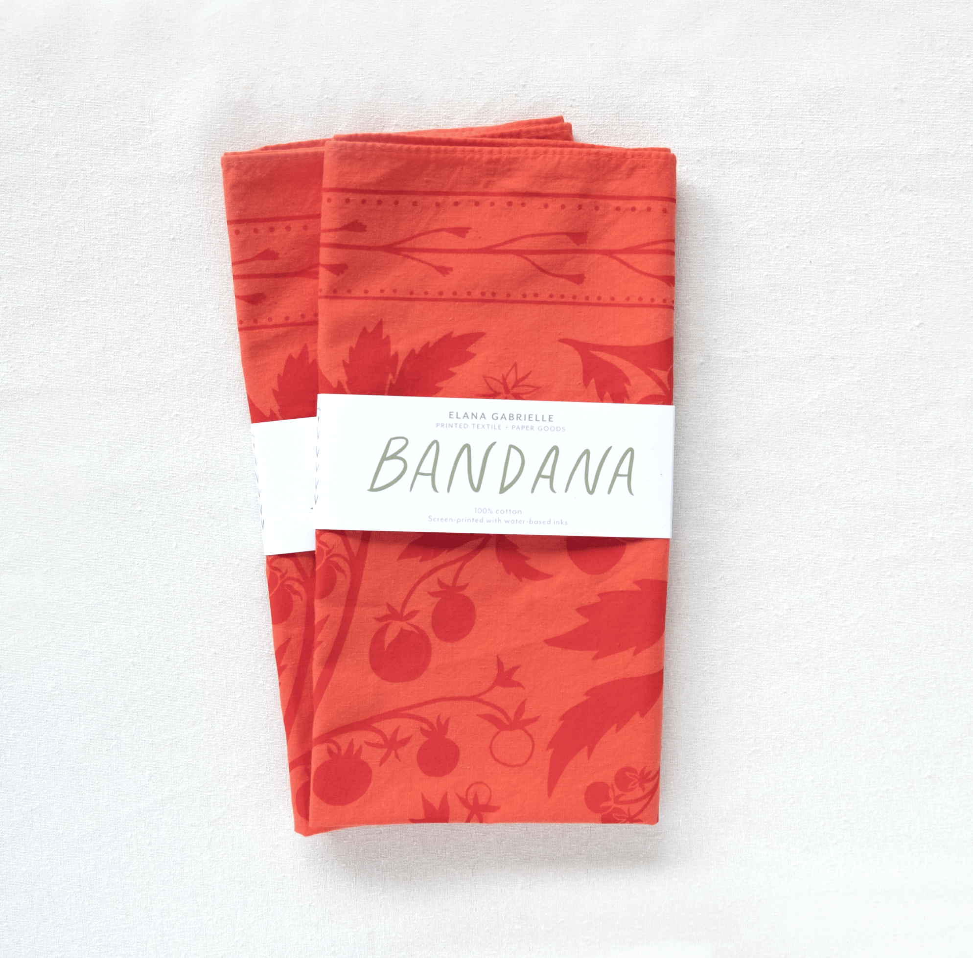 Inspired by garden goodness and sun-warmed tomatoes ripening on the vine this screen-printed bandana is perfect for carrying as an everyday keepsake. Wear it around your neck or in your hair, wrap up snacks and gifts, hang it as a tapestry, and so much more. Bandanas are incredibly versatile and have been worn and used functionally for generations by sailors and seafarers, farmers and cowgirls. Ethically made with 100% cotton and earth-friendly ink, this beautiful and durable textile is a staple of the contemporary wardrobe and makes a wonderful gift.