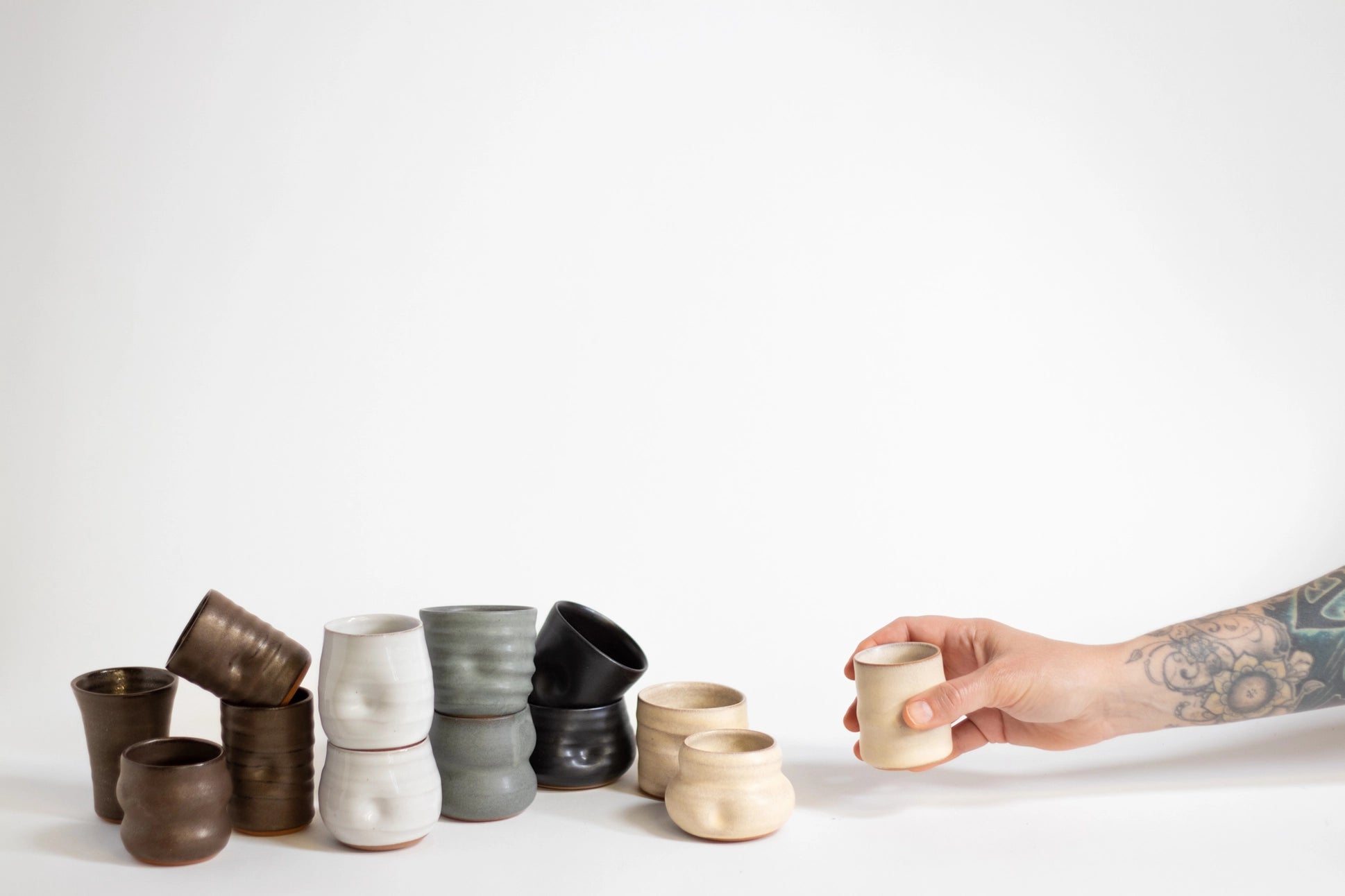The Artist Choice Little Sippers are a fun warm up project for the Gravesco potters. Each one is unique - the whole point of the artist choice collection is that the potters get to make what they want. Cup sizes vary from 1.5" - 2.5" diameter and height.