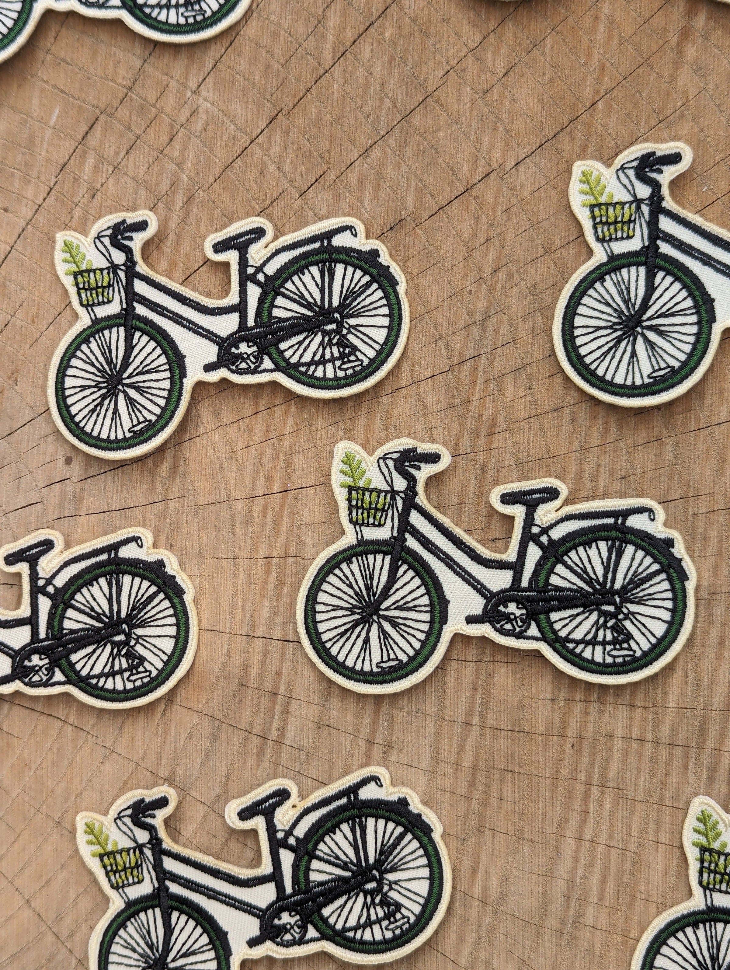 An iron-on patch featuring a vintage style bike with a fern in its basket. The patch is based on an illustration by artist Sara Schalliol-Hodge.