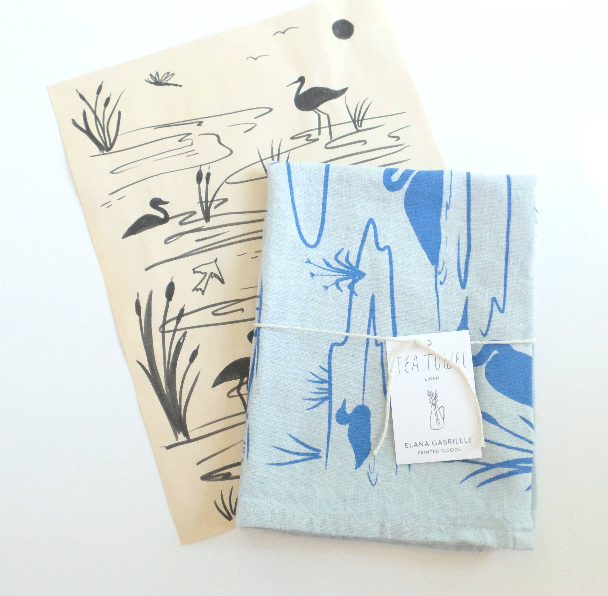 The Estuary Linen Tea Towel is inspired by marsh birds, pond-side cattails, gentle breezes, and bird songs. This kitchen towel is dyed with earth-friendly pigment and screen printed with water-based inks on heirloom-quality flax linen fabric. The tea towel has a lovely tactile feel, soft supple texture, and high absorbency. It has a wide variety of uses and adds some beauty to your space. Perfect for garden parties, rising dough, hung on an oven door, under serving dishes, and so much more. The fabric is sourced from a small family-owned business in Lithuania, chosen specifically for their traditional and ethically produced flax. This soft and sturdy linen inhibits the growth of bacteria and microflora and is a wonderful, sustainable home textile.
