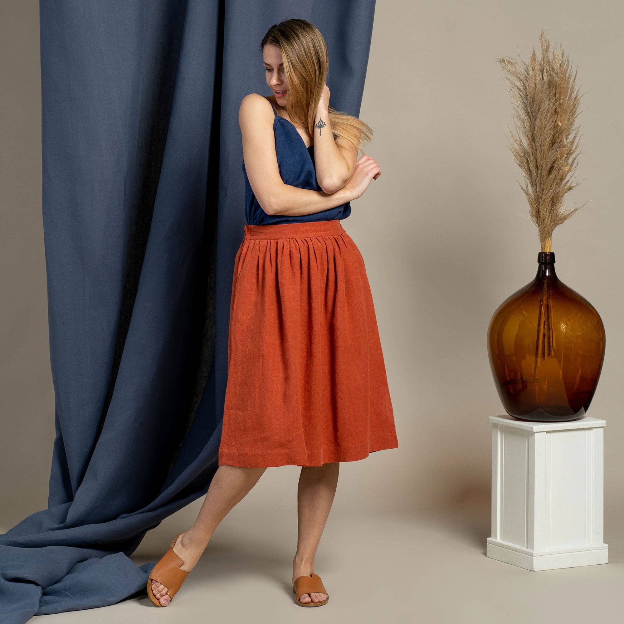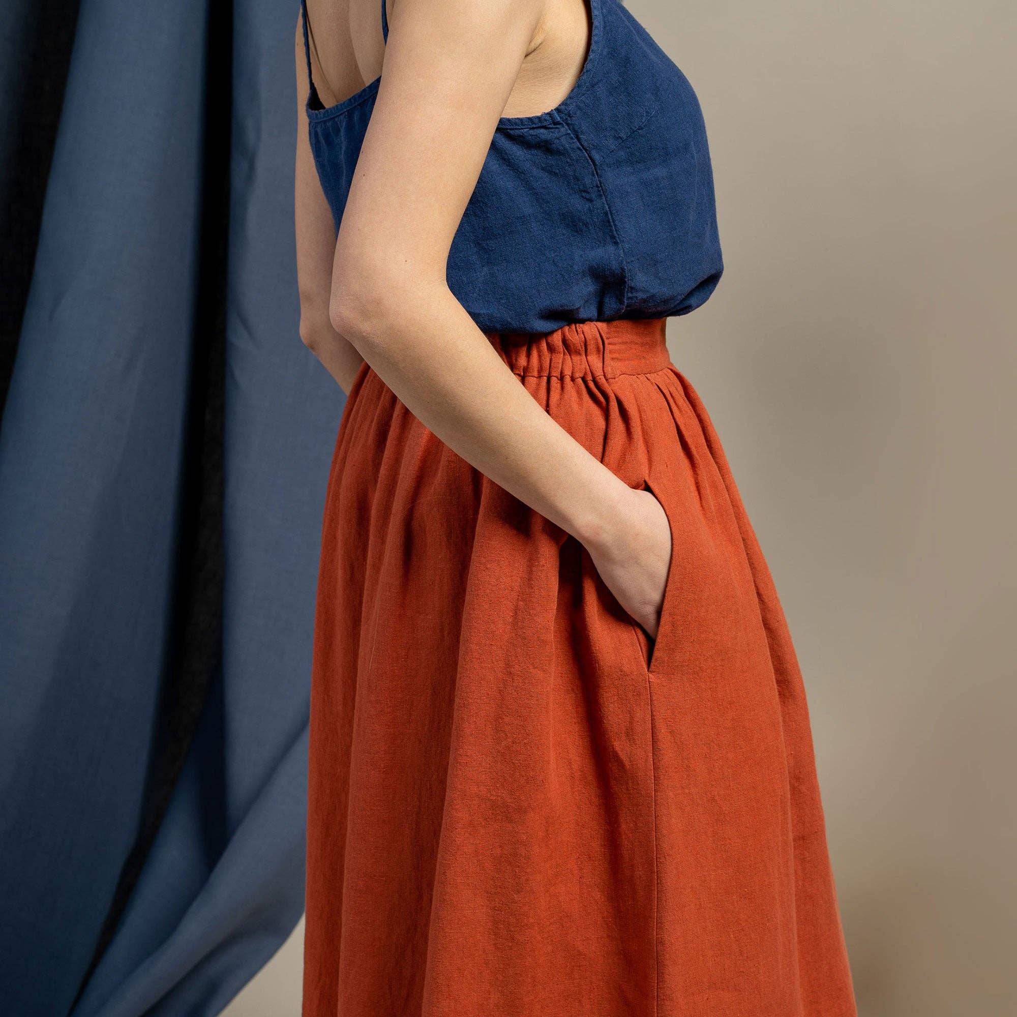 Minimalist, fancy, and romantic – these are just some of the words used to describe our creation. Designed to flow away from your body, the linen skirt features a gentle A-line shape, 2 hidden pockets, and a comfortable wide waistband in front and elastic in the back. If you’re going on vacation, don’t forget to take this with you.
