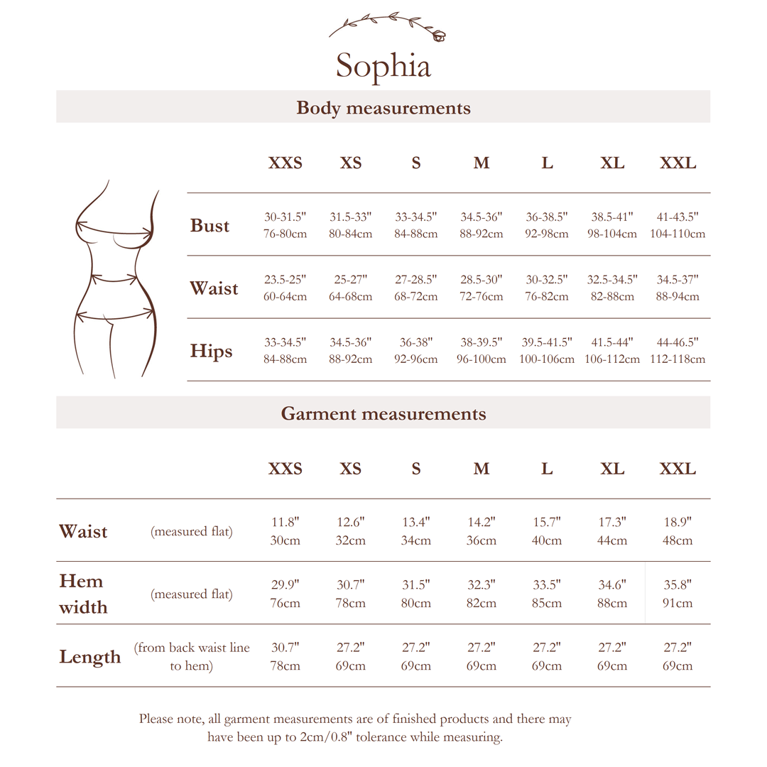 Bust 90cm / 35.4"; Waist 70cm / 27.6"; Hips: 97cm / 38.2".