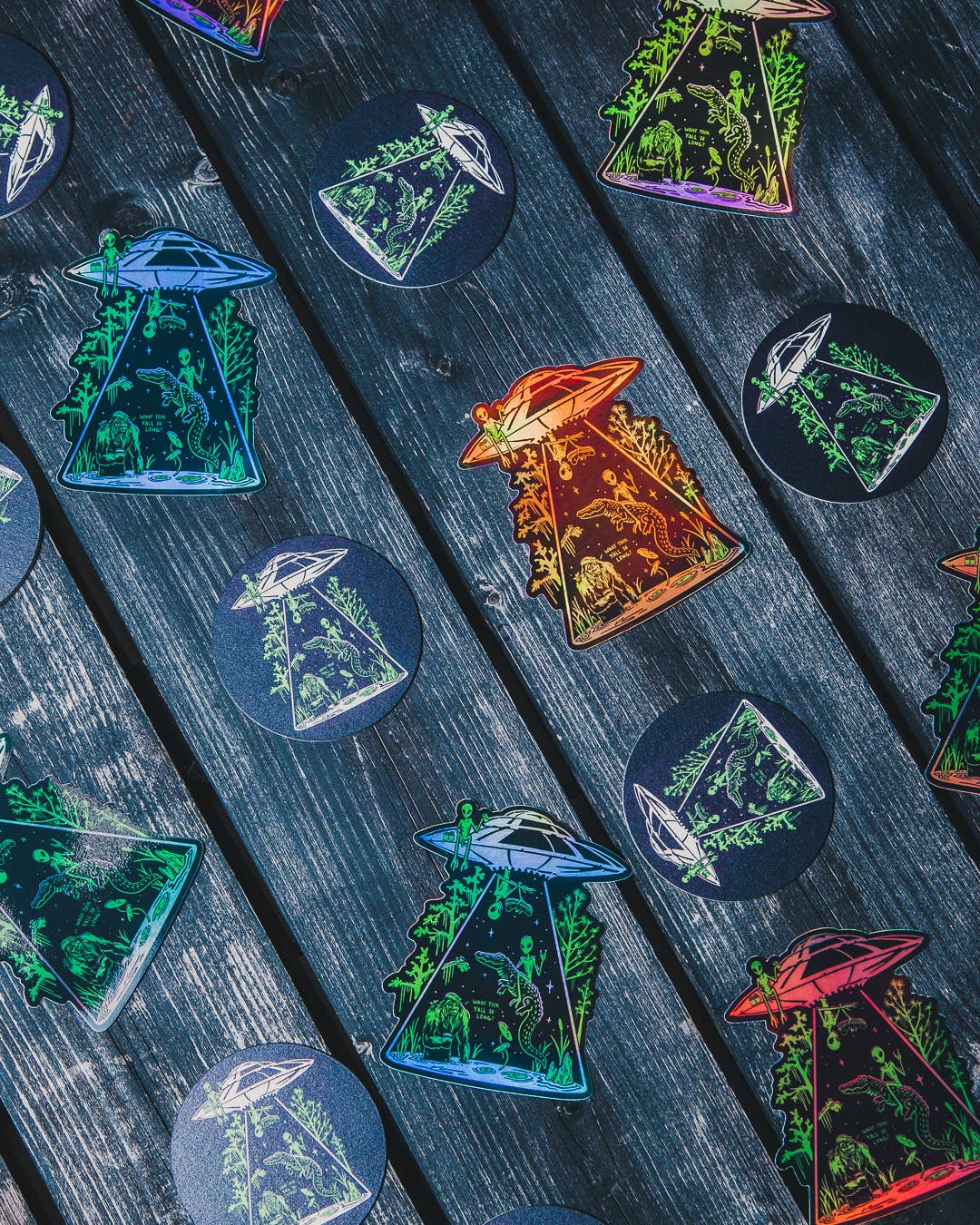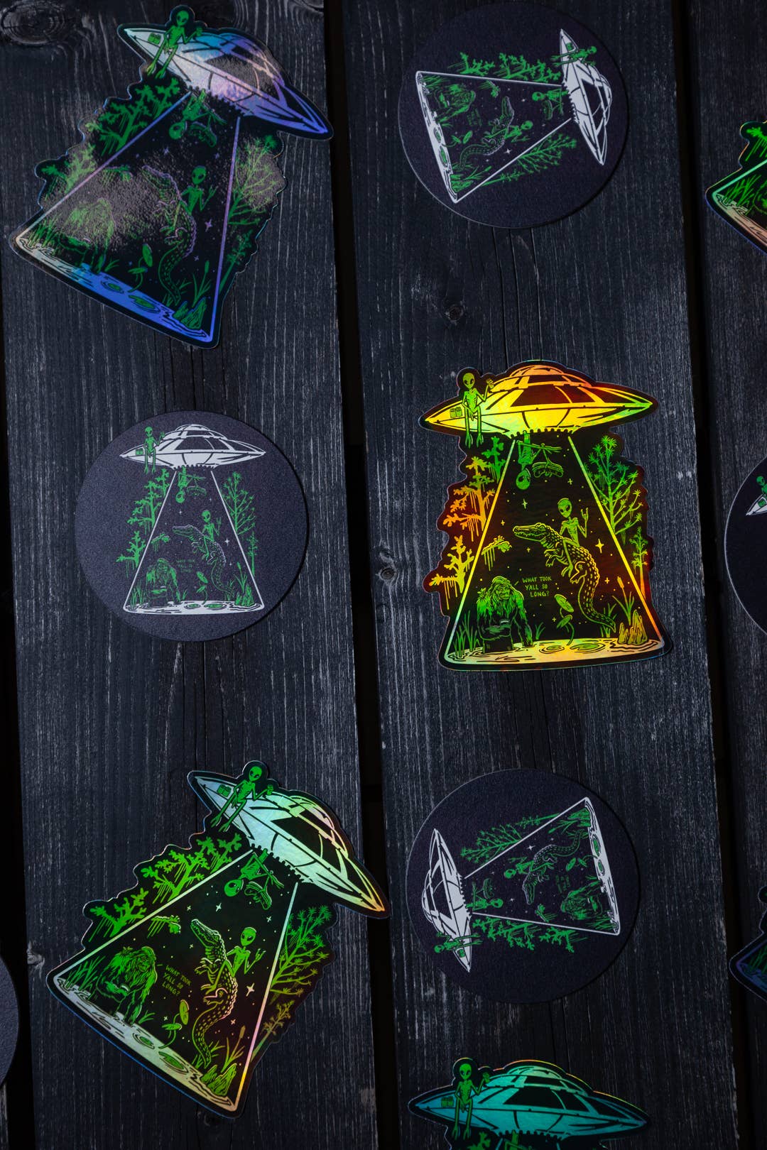 At the end of the day, we are all the same. Whether you're a born & raised Floridian or you grew up in the sticks of Uranus, can't we all just get along over some cheap beers & chicken tendie subs? It's 5pm on a Friday & we're all sliding down in our souped-up UFOs to the nearest watering hole to wrastle a gator & kick it with our Swamp Ape brothern. No matter who it is, Love Your Neighbors with this MASSIVE 5" holographic sticker with intragalactic artwork by V. Steiner. Sticker Size: 3.97" x 5". Shiny holographic finish. Thick, durable vinyl protects this sticker from scratches, water & sunlight. Original art by Veronica Steiner.