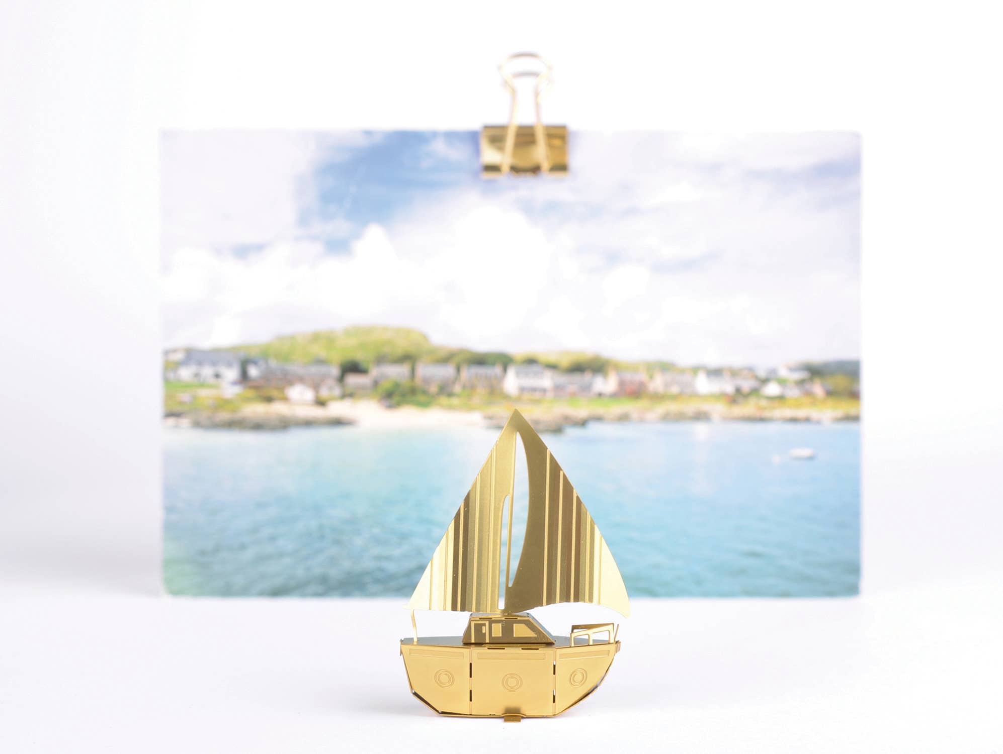 A miniature 3D DIY kit Boat made from rust-resistant brass. The pack contains one flat-packed metal sheet which easily folds together to create a mini three-dimensional model. Full instructions included in the packaging. Mini Models can be kept as charms, trinkets or even placed in a terrarium/plant pot! A great gift for crafters, makers, and plant lovers. Please note that this model is not a toy.