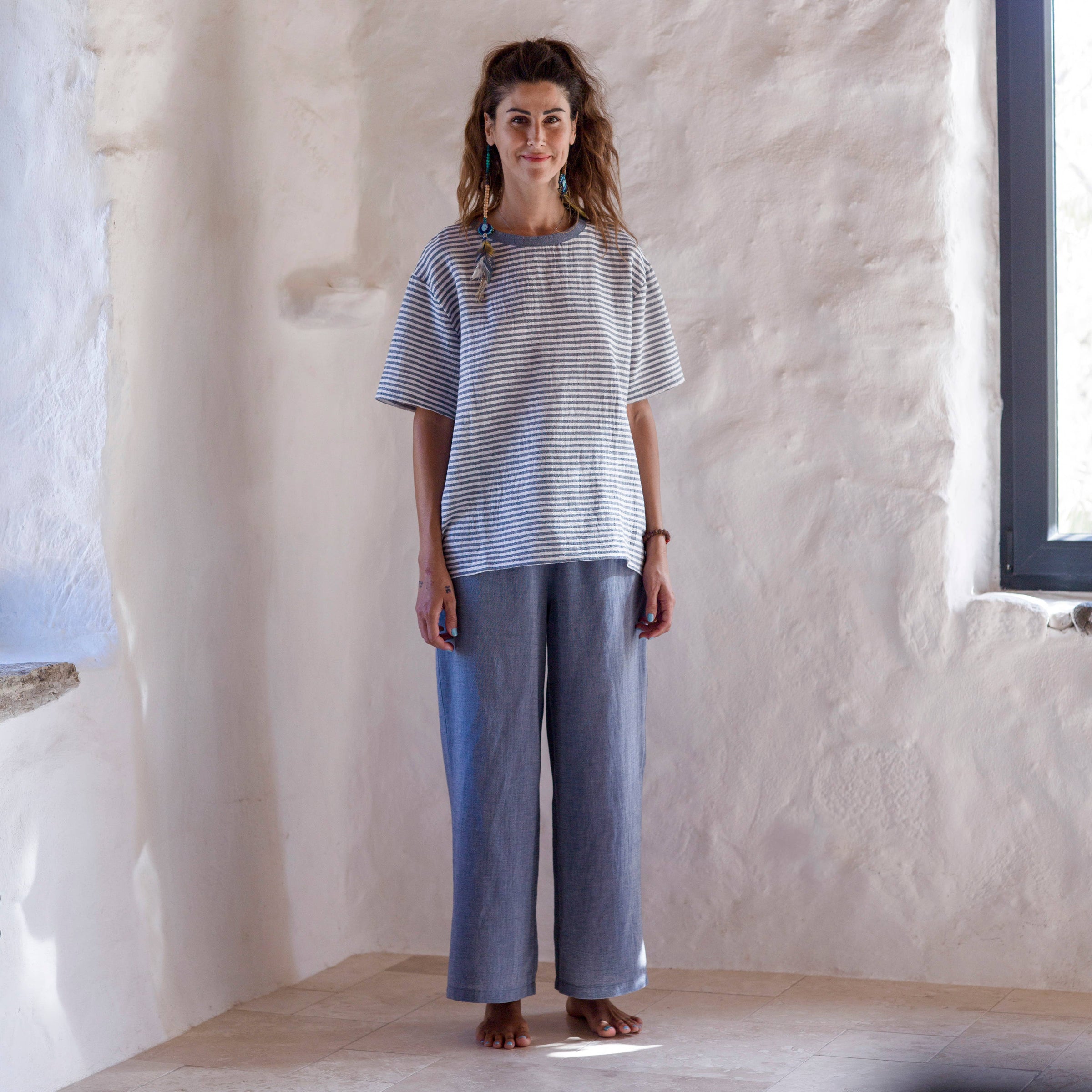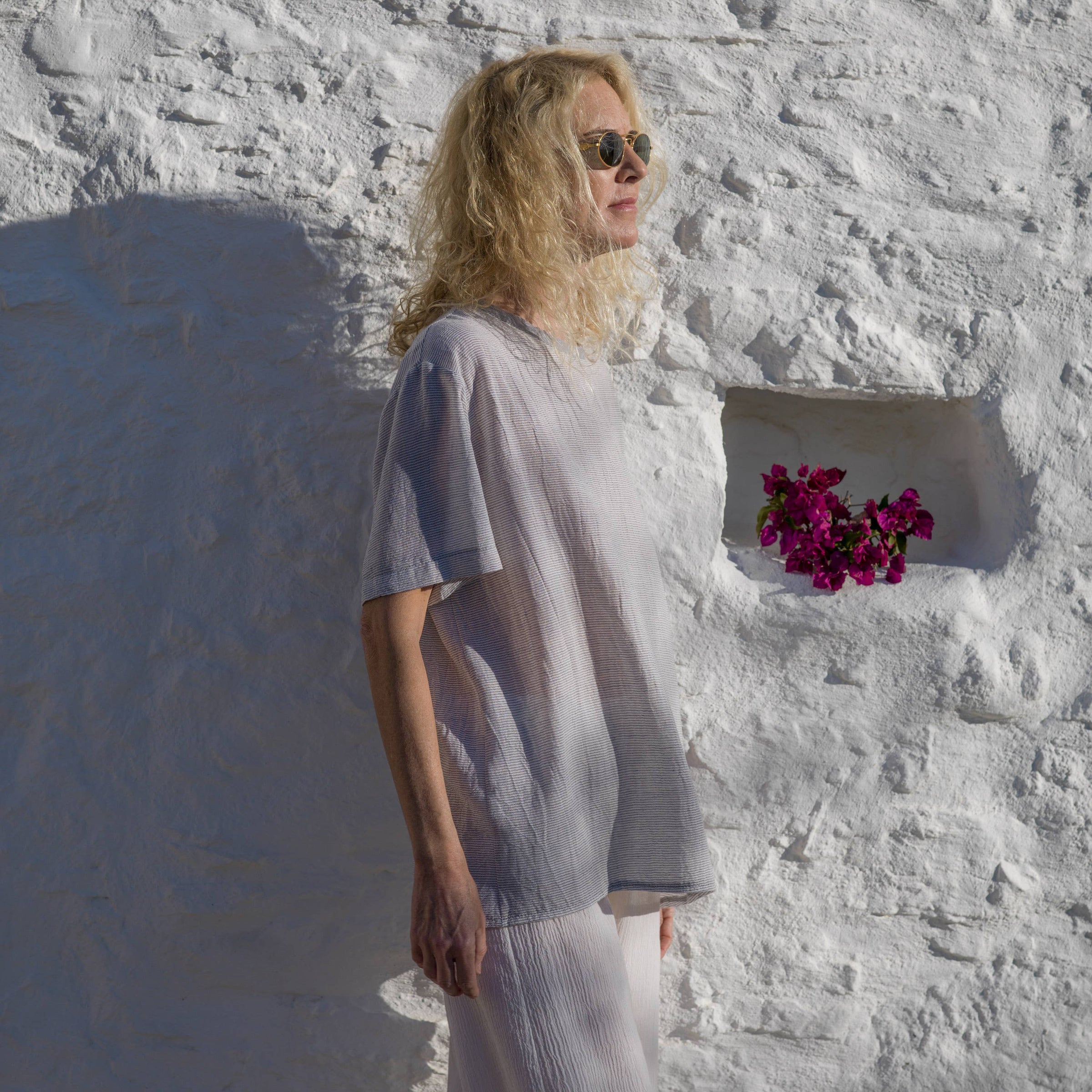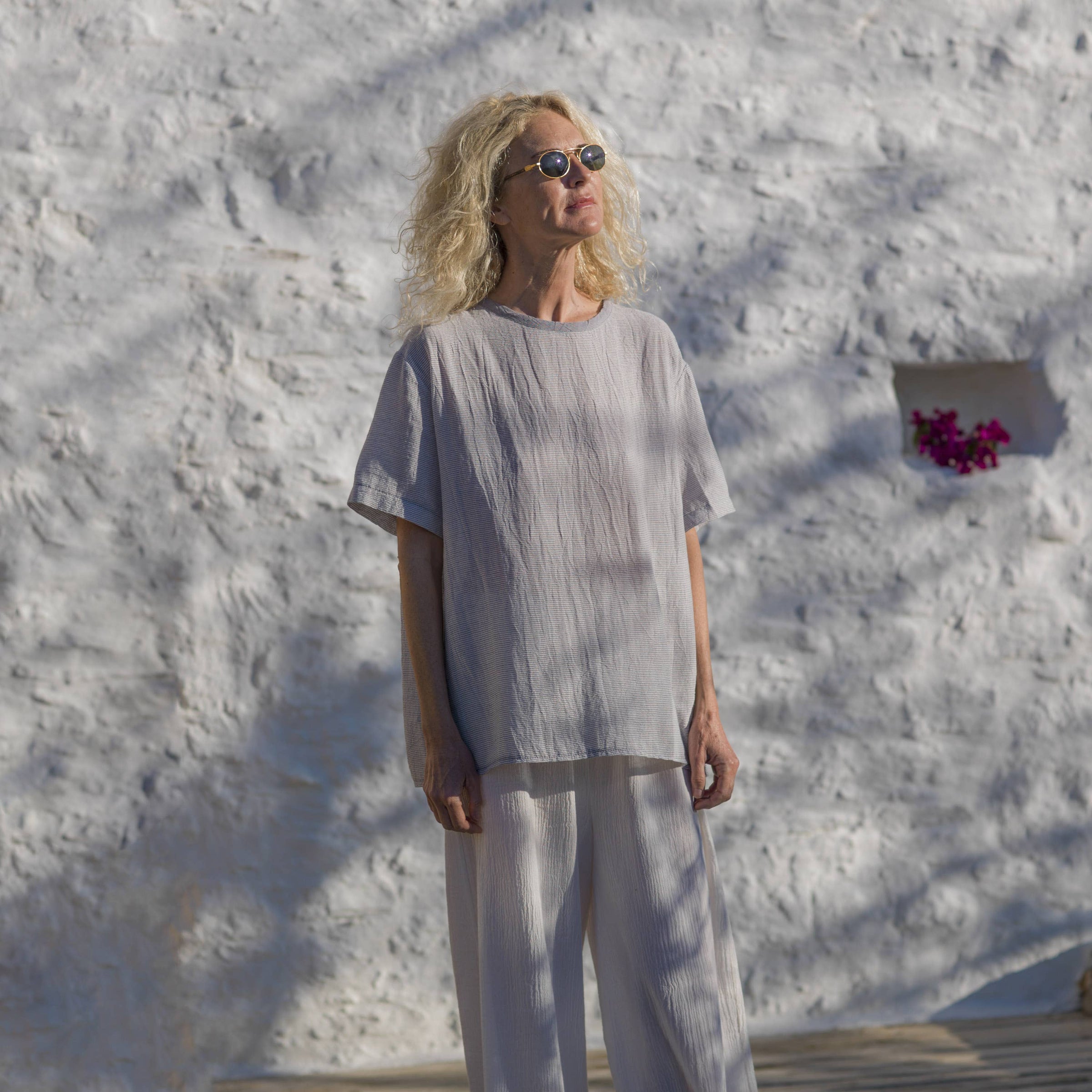With a circular collar, this is a loose comfortable unisex t-shirt, fit for all body sizes, and any occasion Yet its 100% cotton Sile fabric makes it so much more than a regular shirt. Its gauzy quality allows for chic comfort, perfect for warmer climates. It comes in 7 unique colors to us!