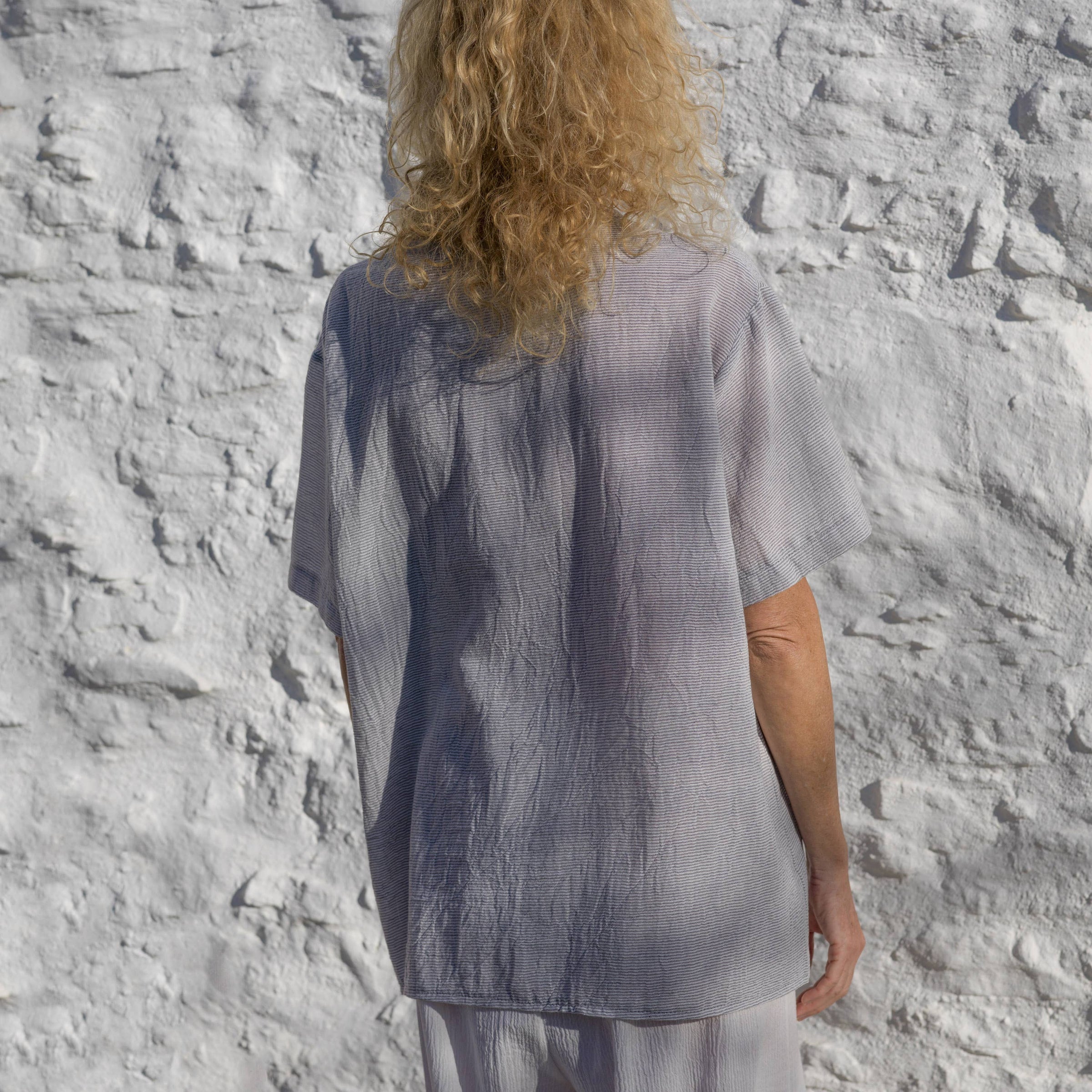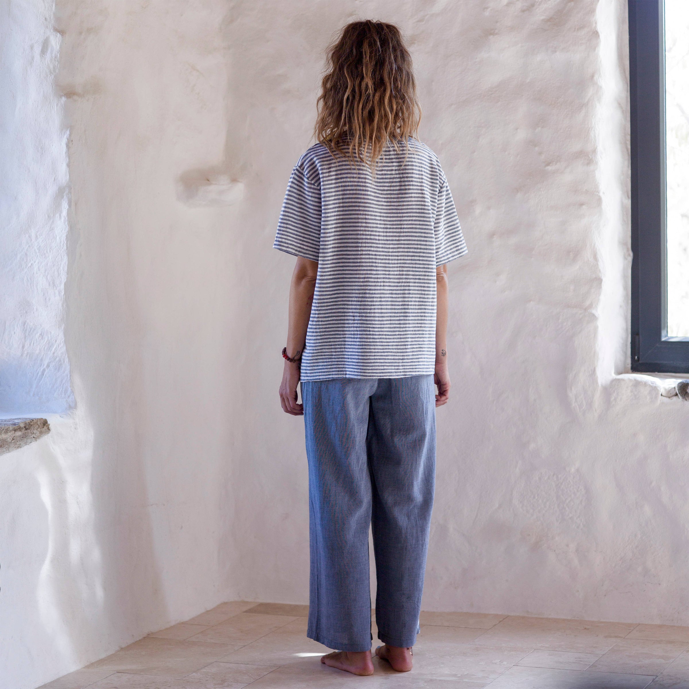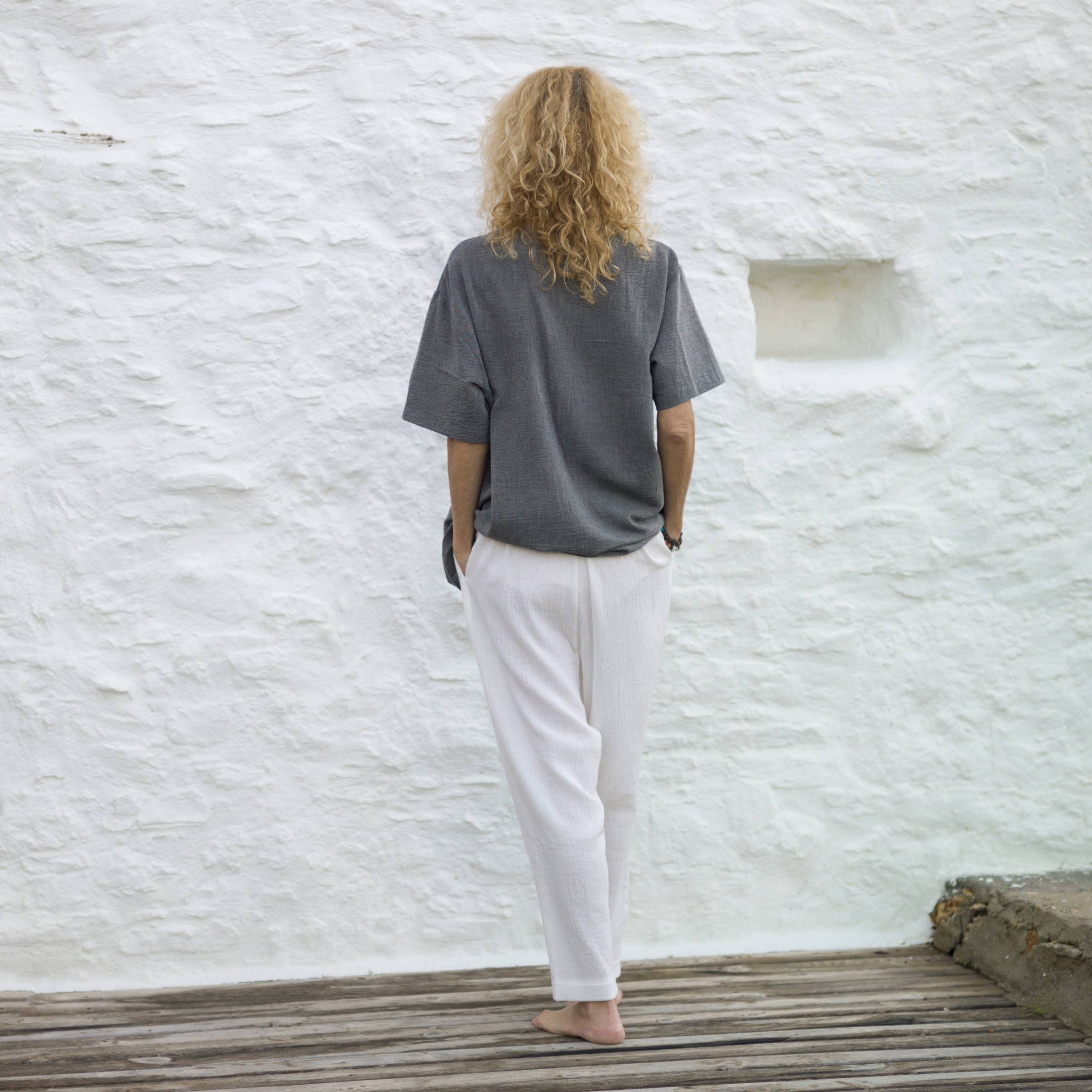 With a circular collar, this is a loose comfortable unisex t-shirt, fit for all body sizes, and any occasion Yet its 100% cotton Sile fabric makes it so much more than a regular shirt. Its gauzy quality allows for chic comfort, perfect for warmer climates. It comes in 7 unique colors to us!
